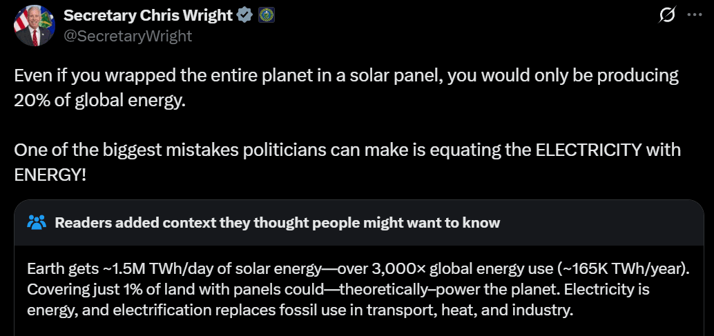 Secretary Wright keeps saying outright false things to try and talk down solar and wind power.