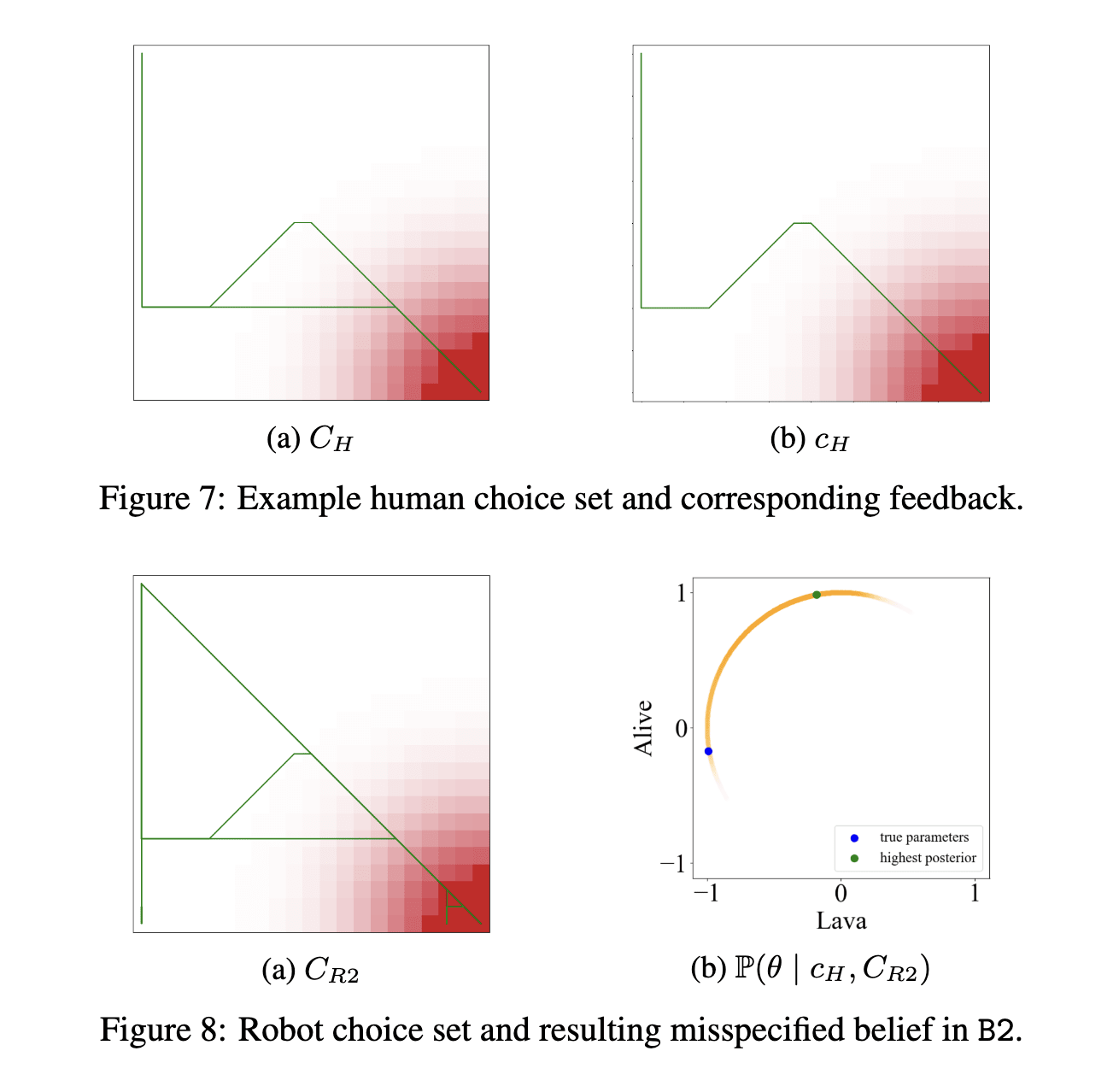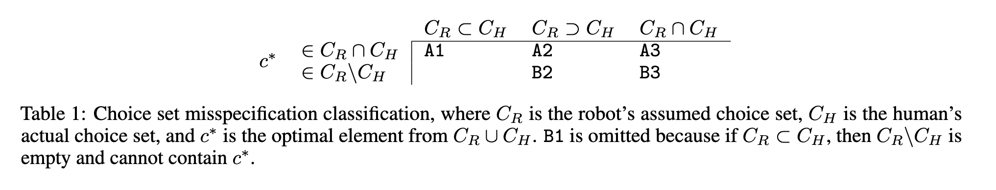 Since IRL depend on human demonstrations they suffer from the issue of human bias (humans are biased over some actions even if they are not optimal), human limitation (for a number of task human's usually stick to a small set of ways to do it without much deviation), and ambiguity (seeing a human perform something it might not be clear why it performed it). One way to capture misspecification (especially the final axis of ambiguity) between human and robots is as a misalignment between the real human and the robot’s assumptions about the human. Formally, you have a set C_H which is the set of choices the human's could have considered during demonstration and C_R which is the robot's assumption about what C_H is. Since its not possible to know C_H or sometimes even match C_R with C_H[4] we end up with choice set misspecification.