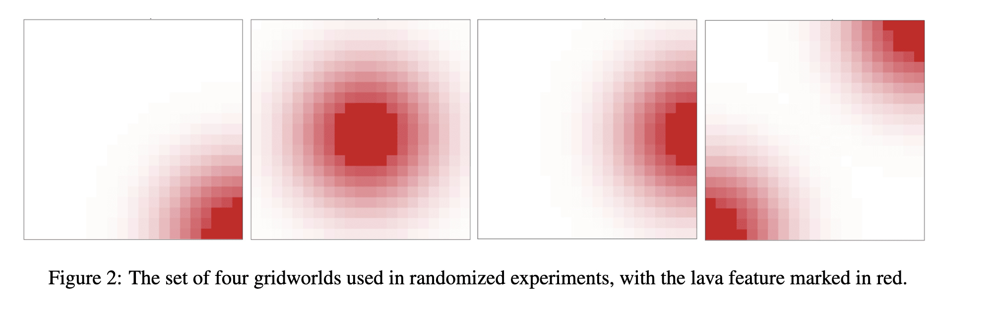 The paper runs a set of experiments on a 20x20 grid, where each cell has a value of lava between [0,1] and it gets 3 rewards (w_lava (mostly negative) reward for coming in contact with lava, (w_alive reward for staying alive and w_goal=2.0 for reaching the final goal). The true reward is a linear combination of these. Here the exhaustive choice set is all the paths that you can take in 35 time-steps (this is an arbitary cutoff for the experiment).