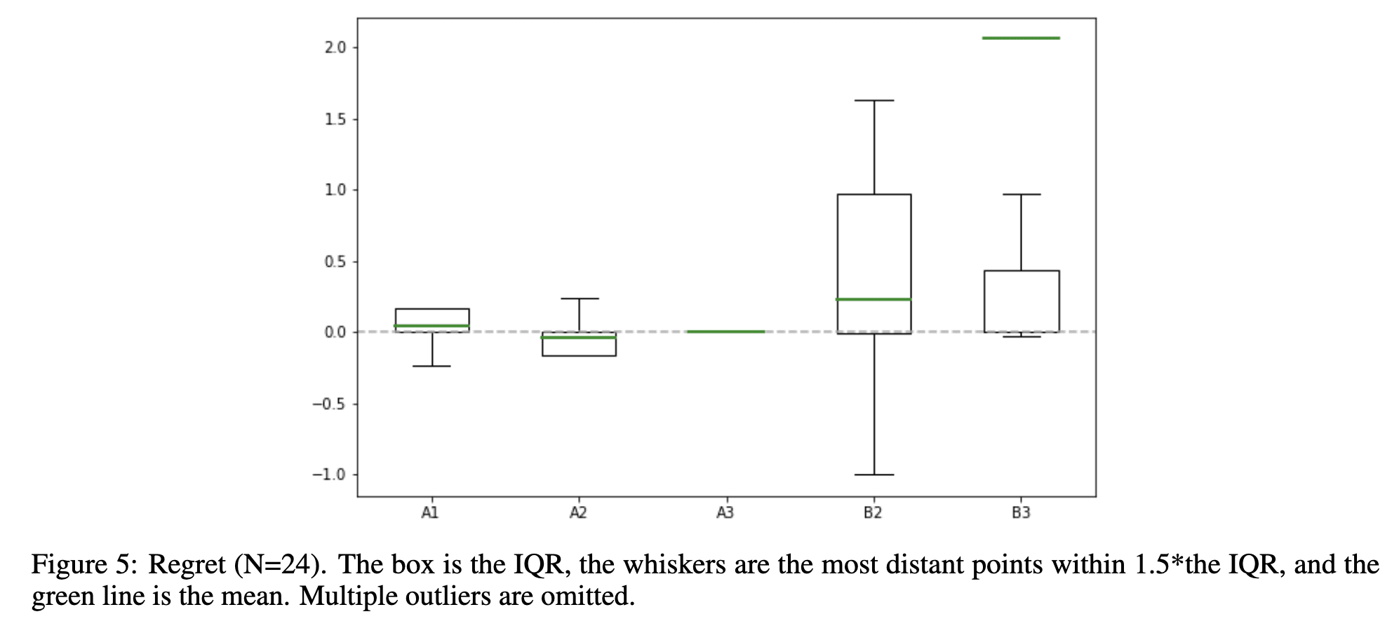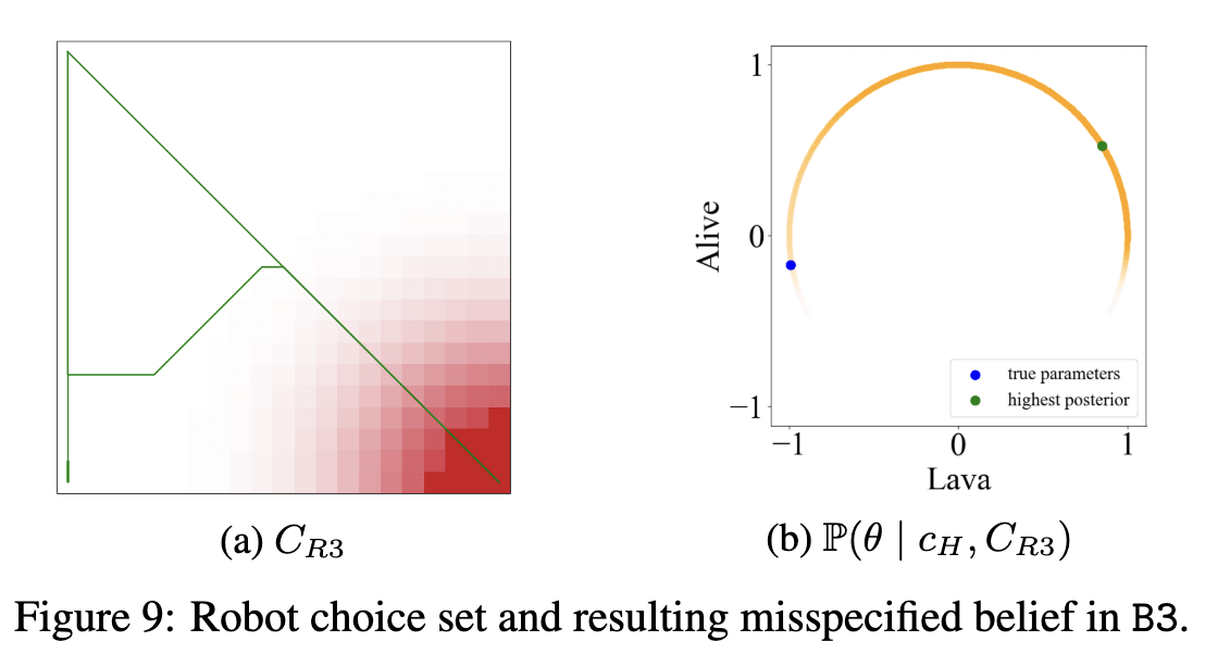 Wait, why did this not happen in B2? Because remember B2 is the case where human choice is subset of robot choice. So, lets say we have 10 human choices, and our was the best of them, this means there are atleast 9 choices in the robot choice (since robot choice is superset) which our worse than . So when we go to the robot and say "adjust your reward to make paths like have more reward value" we are atleast pushing it away from the worst 9 choices, so its not as bad as B3 where we might be pushing towards the worst value itself. What happens if ? This is a very special (and non-practical) case because the human has no choice at all. It can only do one action.