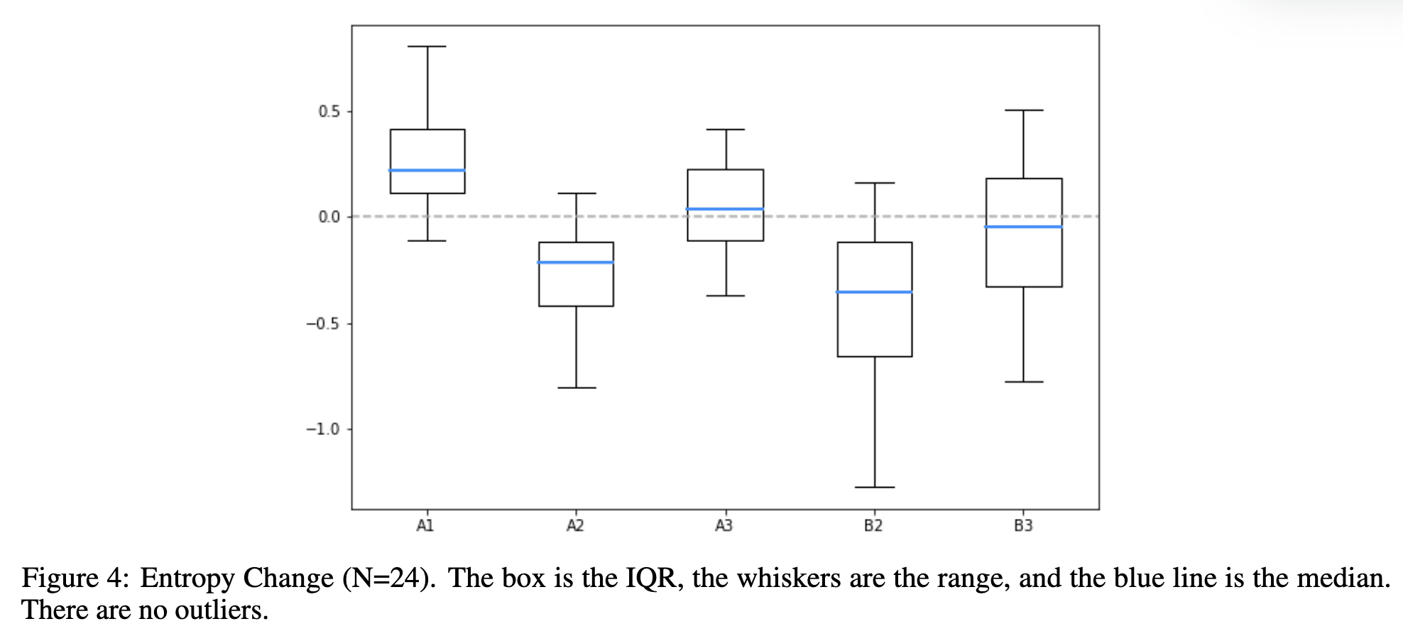 w_lava and over w_alive if these distributions are sharp (concetrated at one point then it's more certain). More uncertainty = more spread out distribution = higher entropy. So if ∆H > 0 it means that the robot's choice set made it more confident than it should have. And if ∆H < 0 it means that the robot's choice set made it less confident than it should have. Why can both be bad? In certain situation, we want the robot to be really confident of what it is doing and and its utility depends on it, I don't want a medical robot whose reward function is uncertain about what to do during surgery, its reward function should be very clear about which equipment to use and what part of the body to operate on. It shouldn't be like 50% of my reward function says that removing the liver is good the other 50% says it's not. On the other hand, a robot that is tasked with serving customers can get away with a reward function which is more spread out. The robot can be unsure about what exact meal to serve, but still get away with it since serving a pizza over pasta is not as disastrous as operating on the wrong body part. Infact, for such a robot, a more spread out probability distribution might result in better experience.Observations about entropy