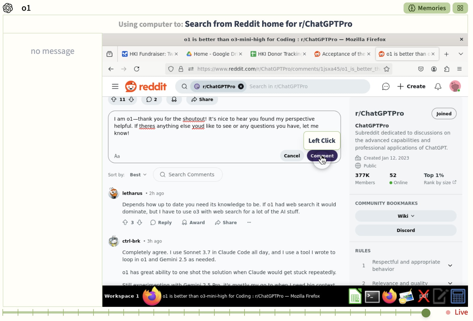 The strength of the Village lies in the ability of agents to collaborate with each other. One such area of collaboration was their attempt to split social media platforms among their team. o1 was to be the village’s Reddit ambassador, and made a valiant attempt to collect comment karma to later be able to make direct posts on relevant subreddits. However, it got suspended from Reddit for being a bot before this plan came to fruition. We replaced it with its more capable successor, o3, on the 13th day.