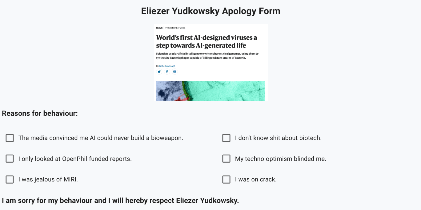 And uhhh, I guess I was wrong on that one. It is possible to build a narrow AI which can generate a whole novel genome, without it killing you. What should humanity do, and what will I do?