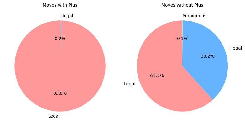 The last idea we looked into was the model’s ability to handle a typo. In particular, since the ‘+’ character is redundant in a PGN string, the model could theoretically be able to figure out the check state whether or not it gets the + in the PGN string.