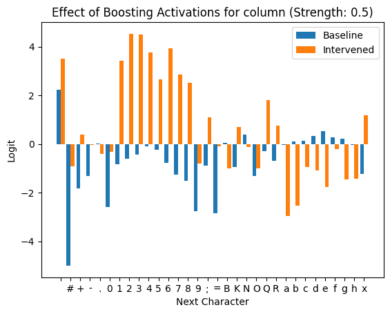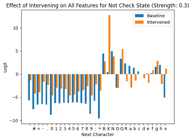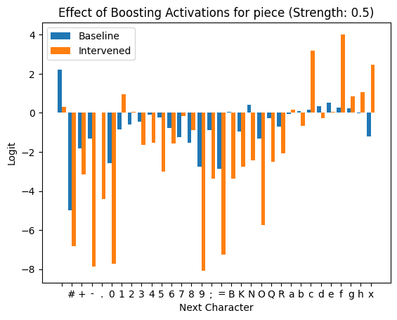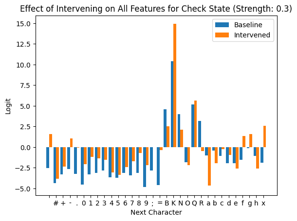 It is also worth noting that many of the logits that are invalid for this point in the PGN pattern get boosted by this intervention. This is likely because we are boosting features that represent being in a different part of the pattern (as discussed in the previous section).