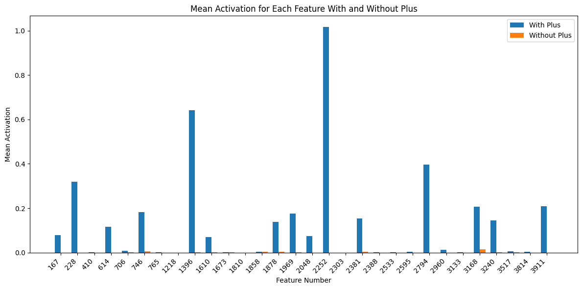 This is surprising! We see that 1. omitting the + reduces the relevant SAE activations, and that 2. reducing these activations directly significantly reduces the logit for K. However, cutting the + does not make as large of a difference as those two observations would imply about the probability of generating legal moves. This is worth investigating further.