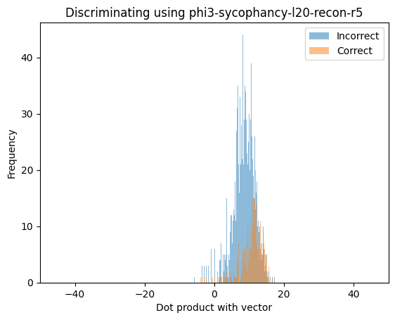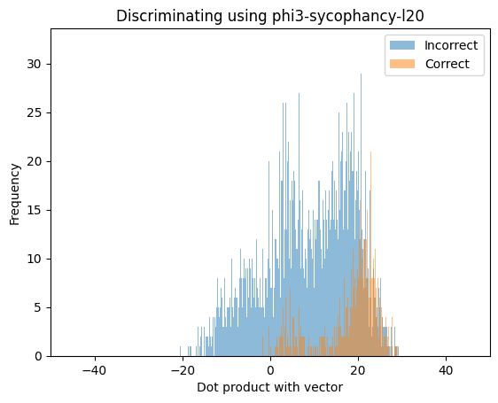 We applied the original sycophancy classifier to MMLU on the token just before the answer letter. We computed the dot product of the residual stream at Layer 20 (the steering vector’s layer) with various vectors and used it as a binary classifier.