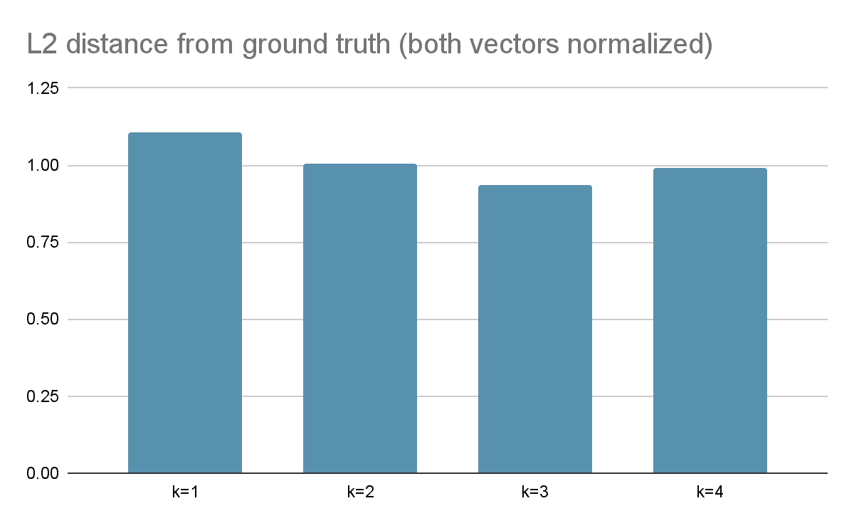 Like in the ITO blog post, we vary the amount of SAE features included in the reconstruction (denoted as k). When we measure the distance from the vector being reconstructed (the abliterated vector), the k=3 vector seems to win. However, k=4 has overall better performance and is close to the skyline vector.