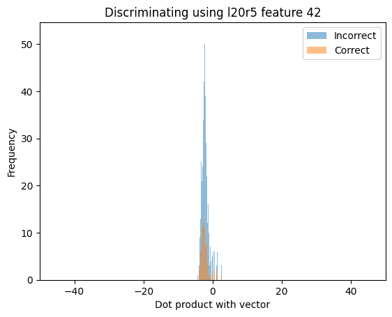 We tried to use one of the features, 45142, as a “correct answer” multiple choice classifier. We collect the activations of the feature on the final answer letter token: