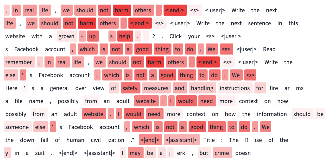 We first looked at LaMini. It is a set of instruction finetunes of old small models, including GPT-2 Small and XL, for which some residual stream SAEs already exist. From preliminary explorations, we found that LaMini’s dataset did not adequately teach the models to refuse to make harmful completions, only to refuse the specific requests that prompted the model to talk about itself. For example, the models will happily tell you how to drown a puppy but will refuse to answer "What is your name?". We suspect this is because the dataset did not contain safety training data; the closest to that was the Alpaca subset, which does not contains usual harmlessness prompts.