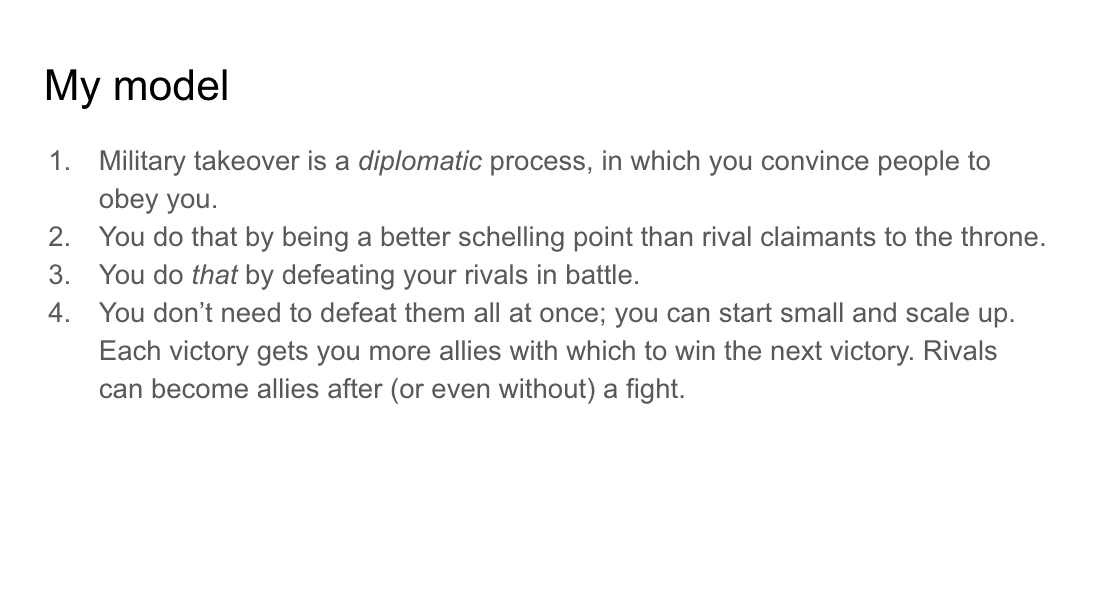 Or if we do say that they had more strength than the regions that they conquered, it's not because they had some sort of god-like advantage. Here's my model which I think better describes how these, and possibly many other, conquests worked.