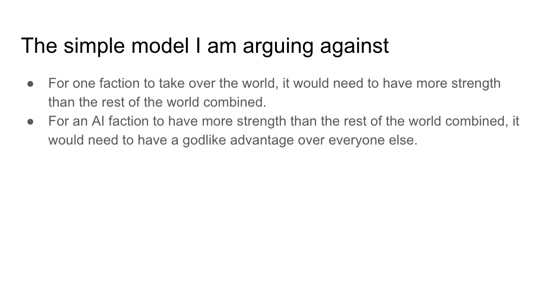 If we're imagining a scenario where an AI appears, it will likely be in some lab somewhere. So it will start off with very few resources, very small amounts of money, for example. So you would have to have some sort of god-like intelligence or a technological advantage in order to have more strength than the rest of the world combined.