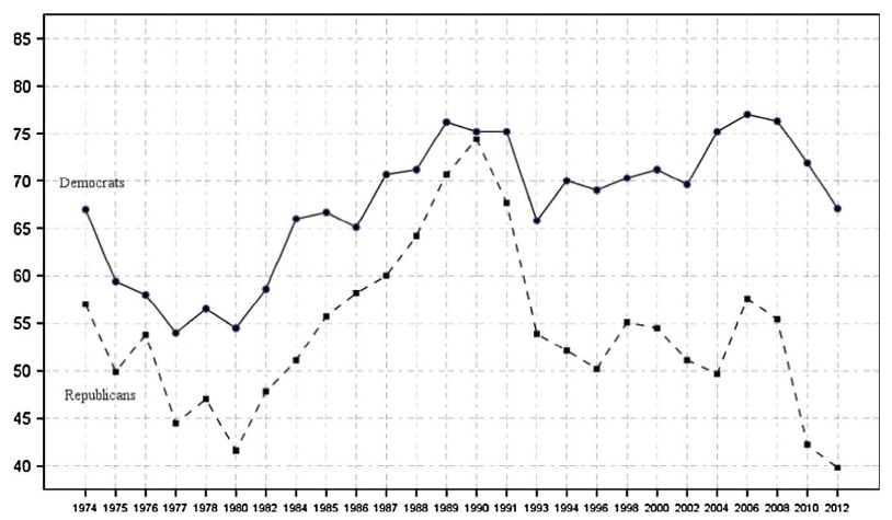 Figure 1: Percentages of Democrats and Republicans reporting that national spending on the environment is “Too Little,” 1974-2012. Reprinted from McCright et al. (2014).