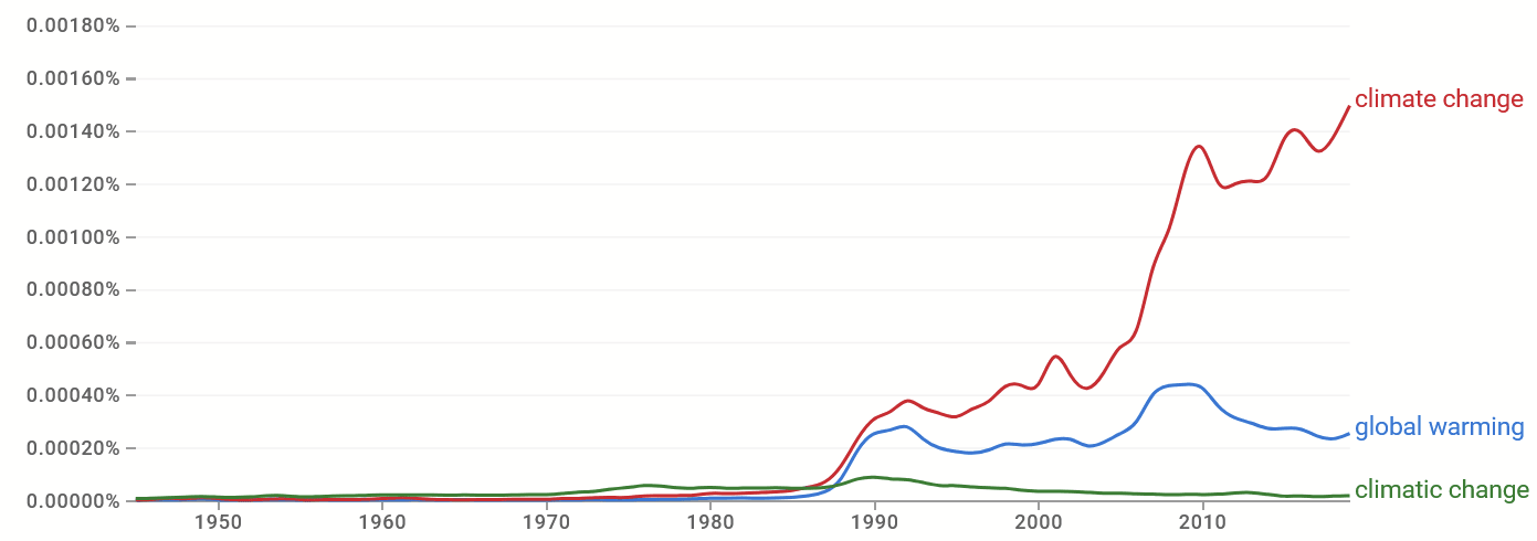 Figure 3c: Frequency of the phrases ‘climate change,’ ‘global warming,’ and ‘climatic change’ in books each year from 1945-2019. From Google Ngram Viewer.