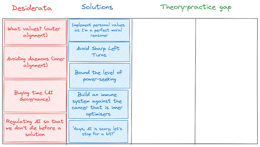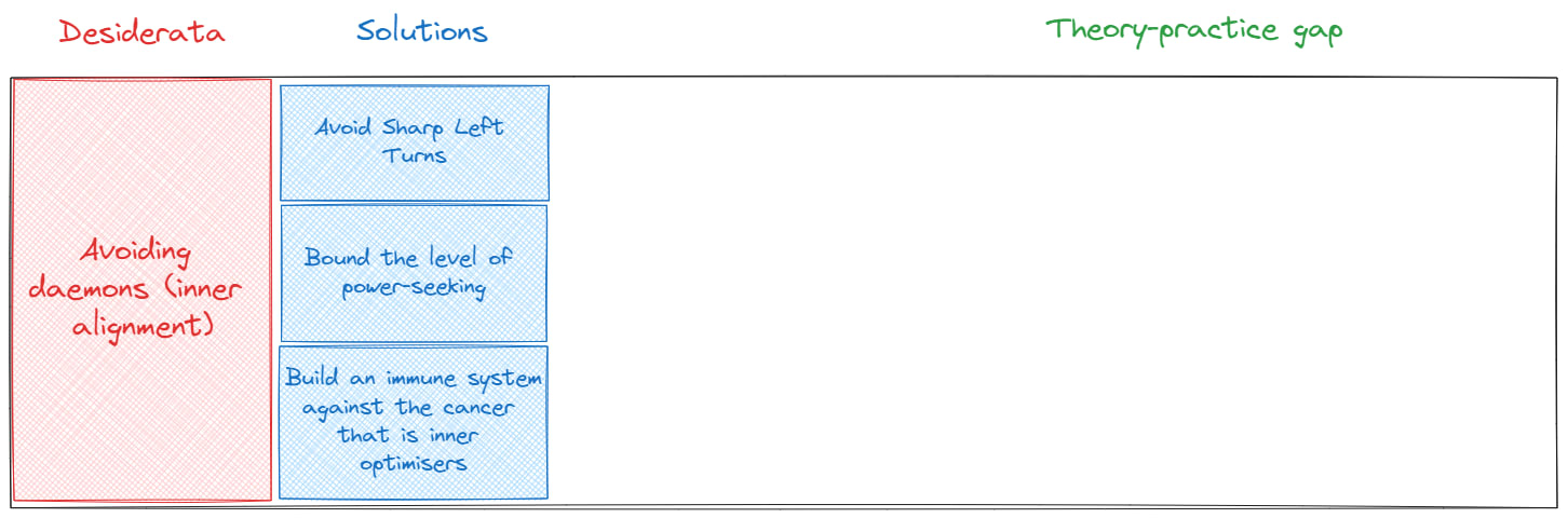 Essentially, the most important part of this exercise is figuring out how to cross the theory-practice gap. We, therefore, want to have problems/desiderata that we believe are sufficient to solve alignment. Then we also want the technologies that are sufficient to solve these desiderata in themselves.