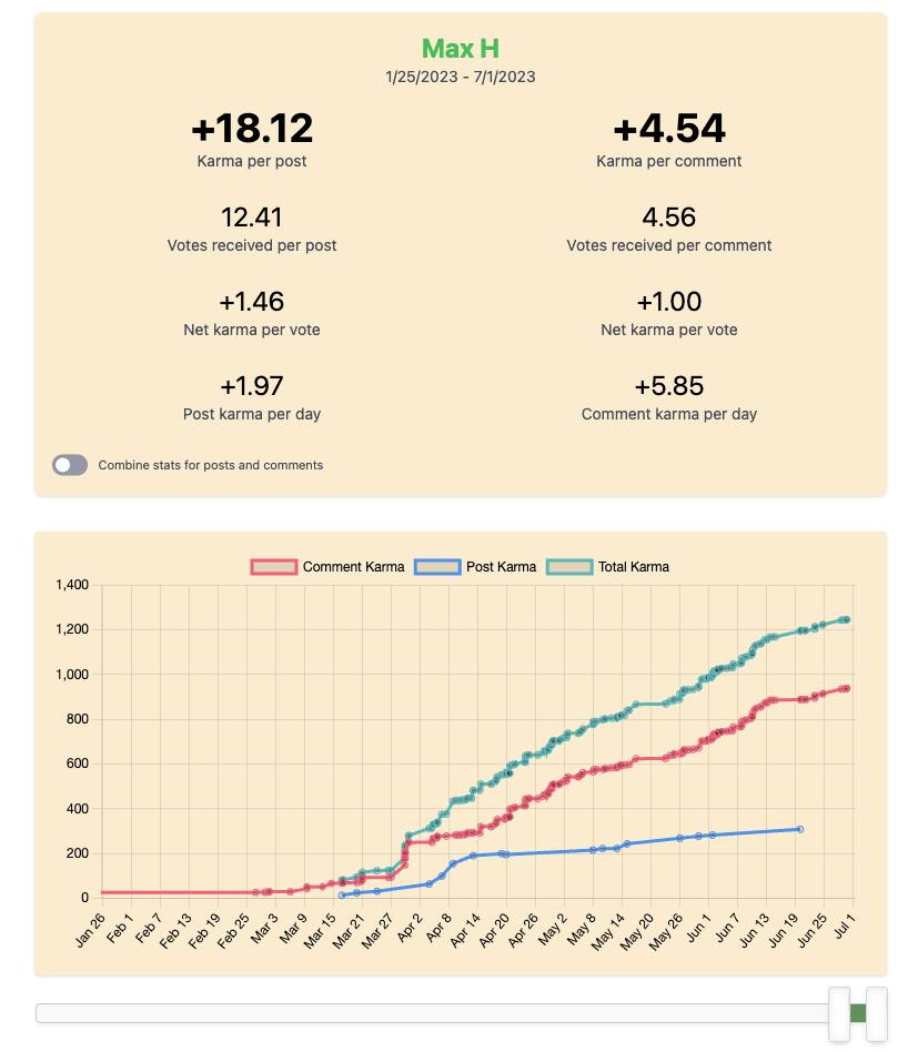 offset doesn't work; the API returns an error for too-big offsets.) If any LW devs (or anyone else) finds a GraphQL query that allows fetching old comments for users with >5000 comments, I can fix this. GreaterWrong somehow accomplishes this to implement sort by top or old, but they appear to be doing it on the backend, so I couldn't reverse engineer it.Aside: this was the first nontrivial greenfield project that I've developed since GPT-4 was released. I used some technologies I was less familiar with (GraphQL, Chart.js, Tailwind CSS), and had GPT-4 write as much of the code as possible. I've been using GitHub Copilot for day-to-day programming for a while, but this was another level. The code quality wasn't always great, and I'm not sure how much time it really saved me in the end, but it definitely helped me get up to speed with unfamiliar libraries faster, and it was pretty wild to just ask GPT to re-arrange or format the elements on the page and have it produce something that looked pretty good on the first try.