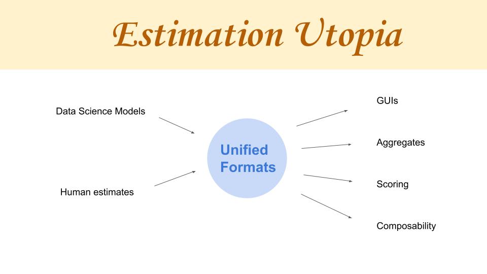 So in Estimation Utopia, as I call it, we’d allow for people to take the results of their data science models and convert them into a unified format. But also, humans could just intuitively go ahead and write in the unified format directly. And if we have unified formats that are portable and could be run in different areas with different programming languages, then it would be very easy to autogenerate GUIs for them, including aggregates which combined multiple models at the same time. We could also do scoring, which is something that is obvious that we want, as well as compose models together.