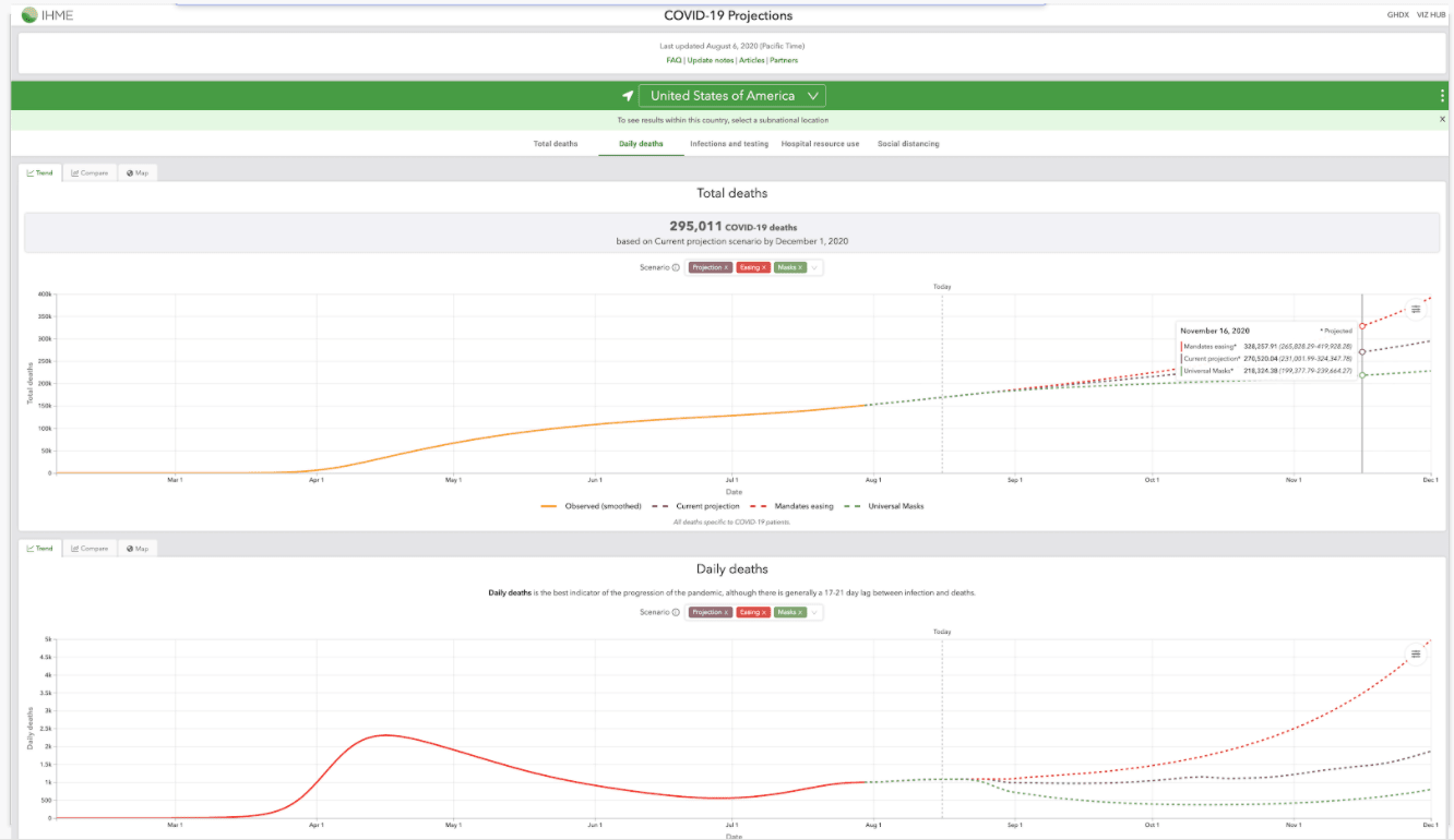 You can see that it made projections for total deaths, daily deaths, and a bunch of other variables. And for each indicator, you could choose a country or a location, and it gives you a forecast of what that indicator may look like.