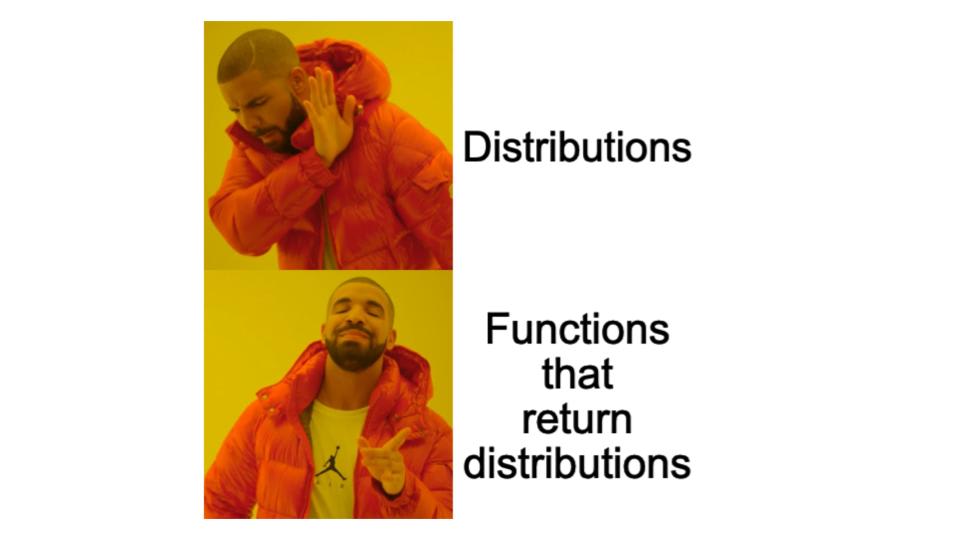 Basically, distributions are kind of old school. People are used to estimating and predicting them. We don't want that. We want functions that return distributions -- those are way cooler. The future is functions, not distributions.