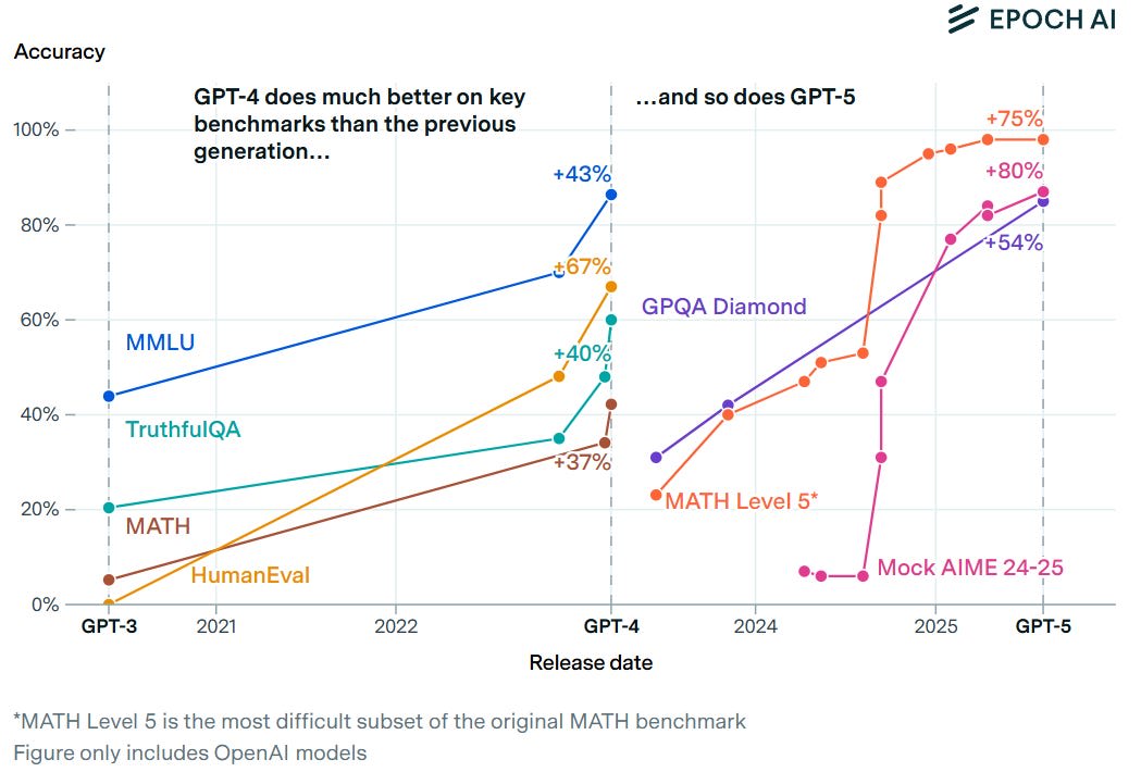 GPT-5 and GPT-4 were both major leaps in benchmarks from the previous generation.