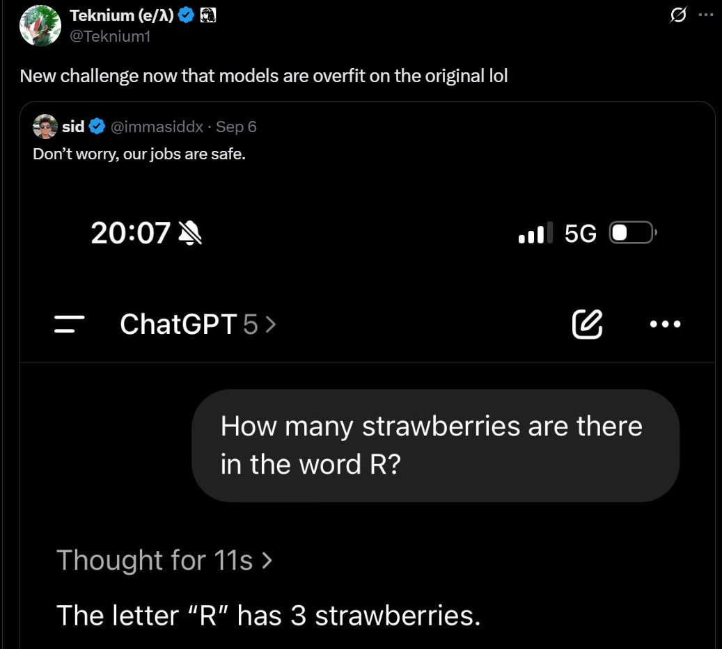 I mean, that’s very funny, but it is rather obvious how it happened with the strawberries thing all over Twitter and thus the training data, and it tells us very little about overall performance.