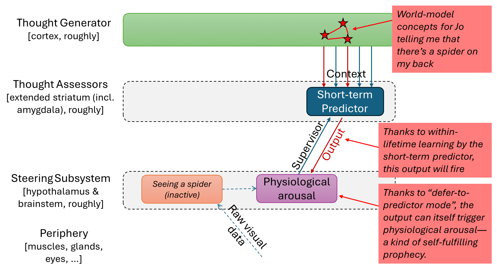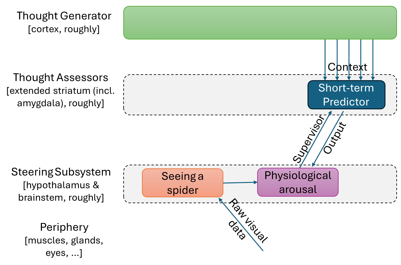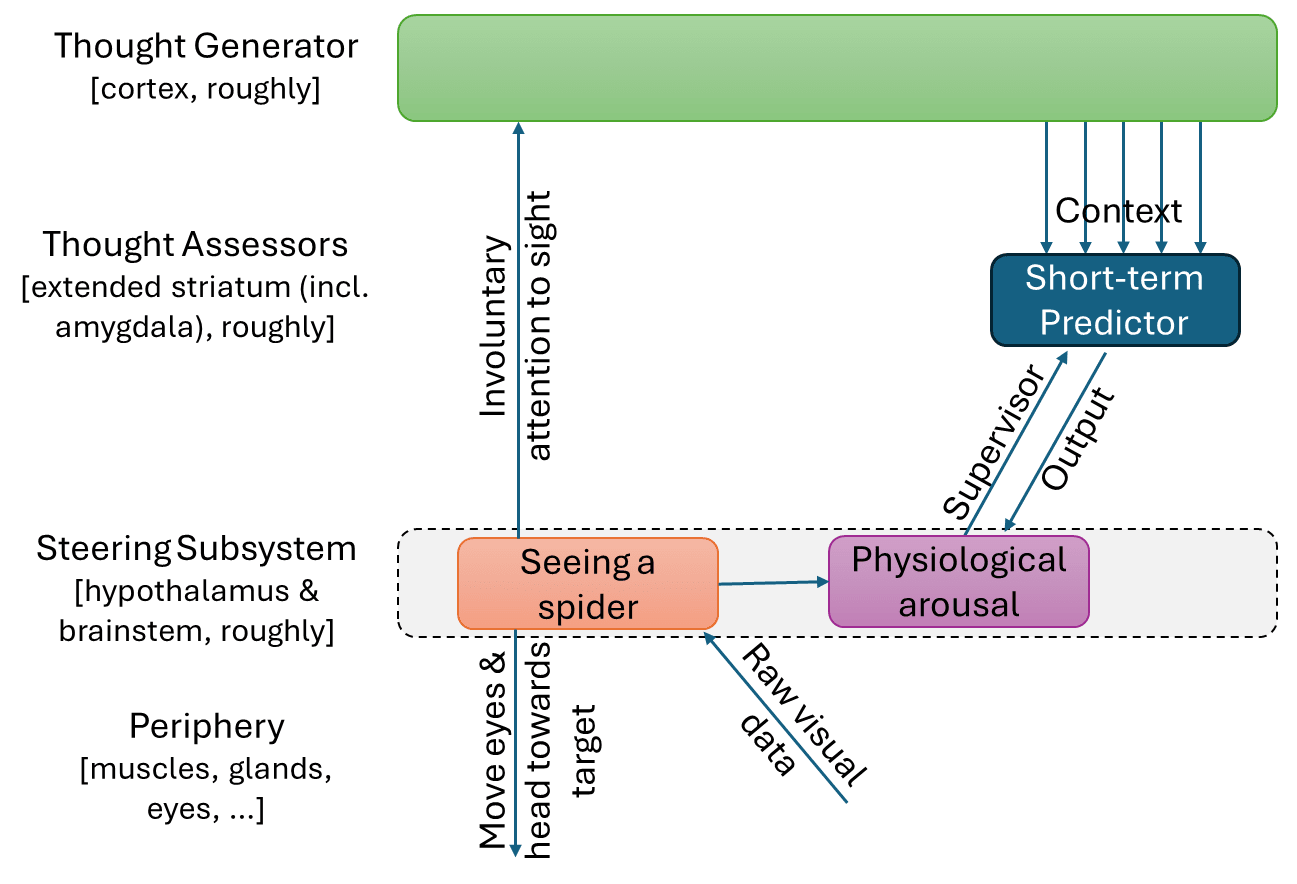 Ingredient 1 is a first step towards understanding, say, fear-of-spiders. But it’s not the whole story, because I don’t just get nervous when there is actually a large skittering spider in my field-of-view right now, but also when I imagine one, or when somebody tells me that there’s a spider behind me, etc. How does that work? The answer is: what I call the “short-term predictor”.