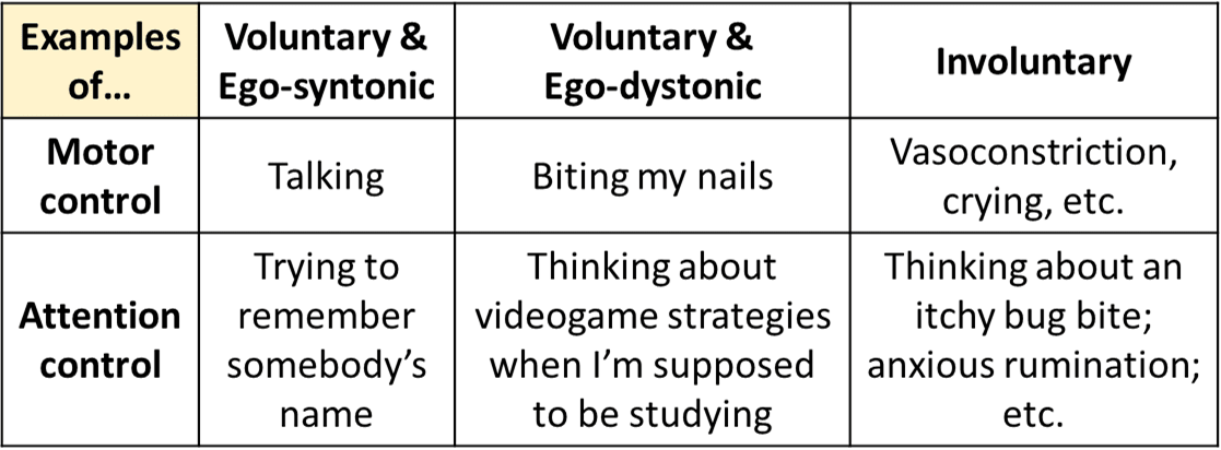 Involuntary lack-of-attention signal: Well, absence-of-attention might just involve suppressing presence-of-attention pathways, like the ones I mentioned under Ingredient 3 above (possibly involving acetylcholine). Or it might be a different system that pushes in the opposite direction—maybe involving serotonin? Or (more likely) multiple complementary signals that work in different ways. I don’t have any strong opinions here.