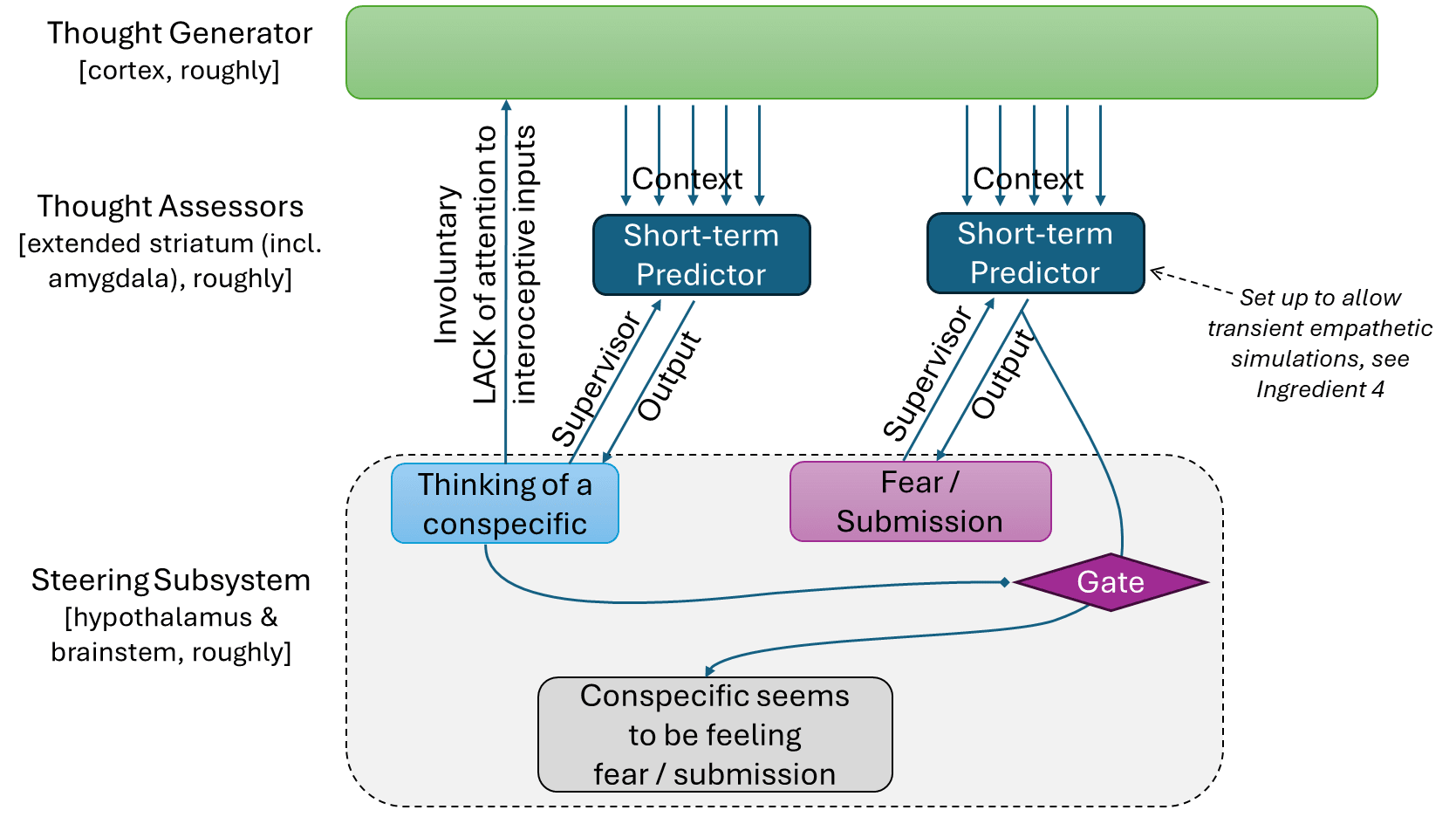 All we need to get that gray box, beyond what we’ve already covered, is a gate: If the thinking-of-a-conspecific flag is on, AND there’s a short-term predictor output consistent with (dis)pleasure, then that means I’m thinking about a conspecific who is currently feeling (dis)pleasure.