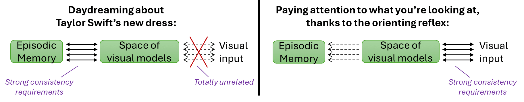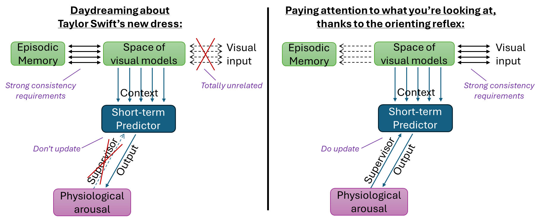 The involuntary lack of attention transiently disconnects the interoceptive models from what I’m feeling right now. Instead, the space of interoceptive models in the cortex will settle into whatever is most consistent with what’s happening in the visual, semantic, and other areas of the cortex (a.k.a. “global workspace”). And thanks to the orienting reflex, those other areas of the cortex are modeling Zoe.