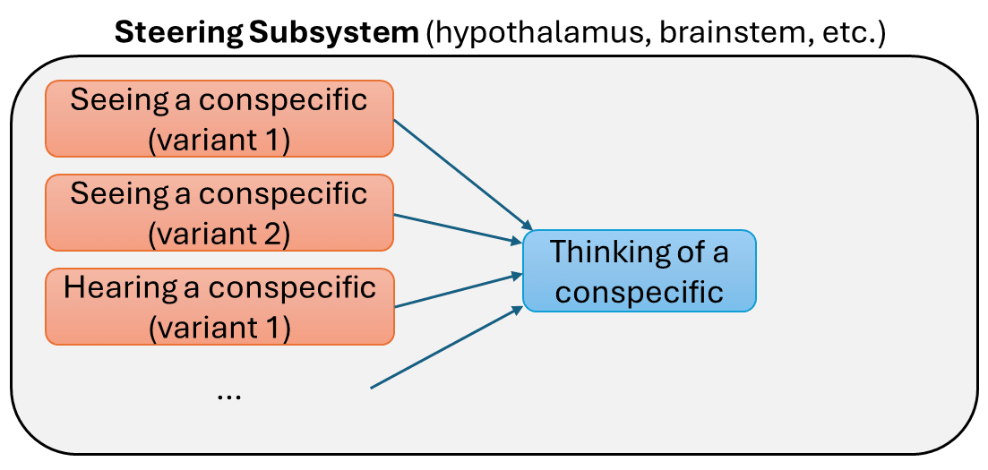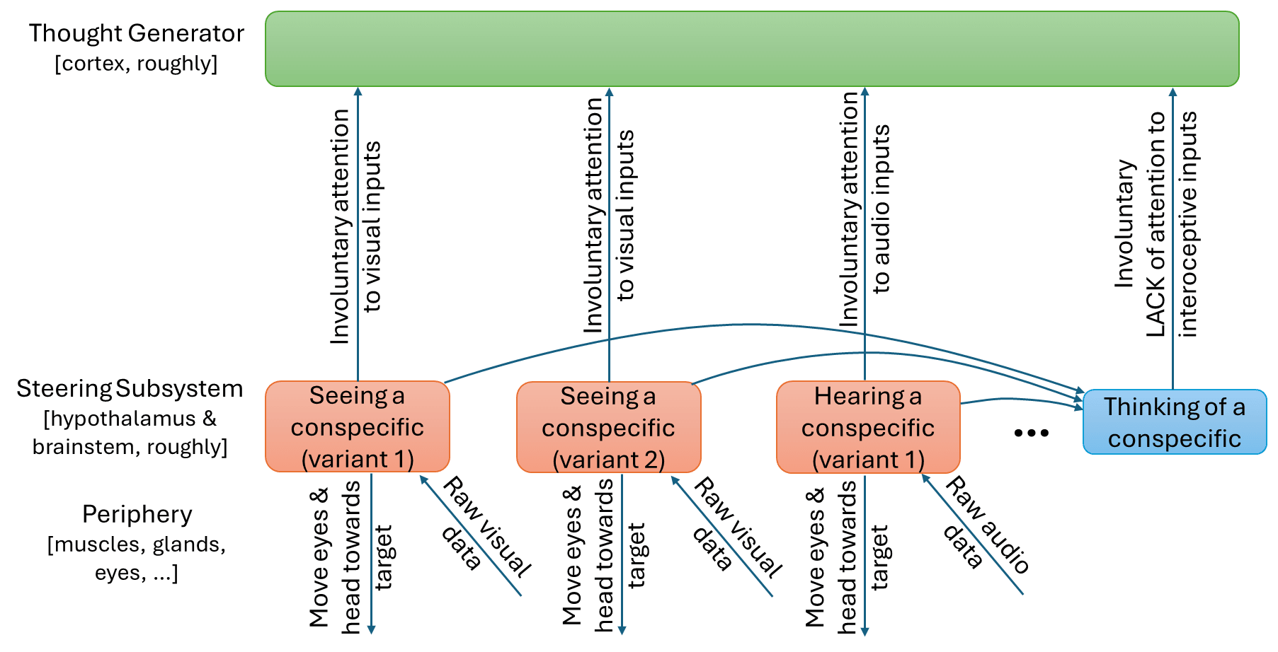 I claim that these all trigger a special Steering Subsystem flag that I call “thinking of a conspecific”: