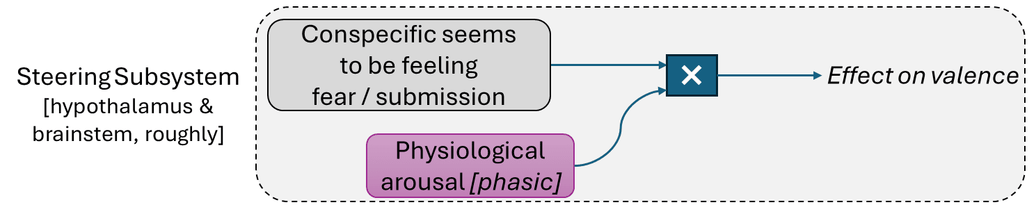 Basically, when I orient to a conspecific, then recognize them, the associated phasic arousal[11] tracks how important (high-stakes) is this interaction with the conspecific, from my perspective. Then we use that to scale up or down the compassion / spite response.