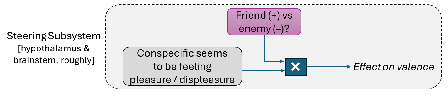 Anyway, when the “friend (+) vs enemy (–)” parameter is positive, then “conspecific seems to be feeling pleasure / displeasure” causes positive / negative valence respectively. This innate drive would lead to compassion—we feel intrinsically motivated by the idea that the conspecific is feeling pleasure, and intrinsically demotivated by the idea that the conspecific is feeling displeasure.