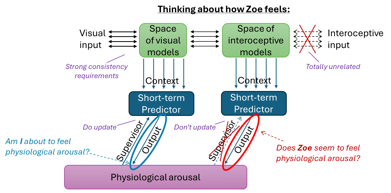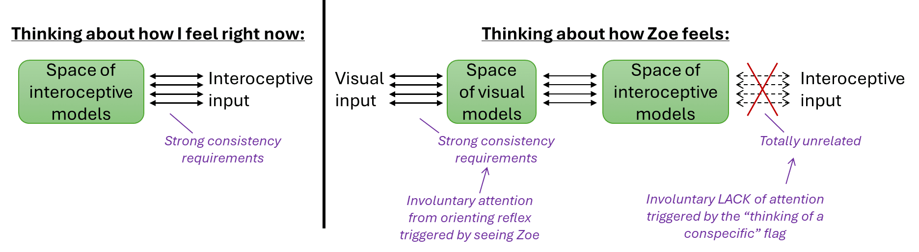 The sense in which this is true is: both the interoceptive model space and the associated short-term predictors are trained in a circumstance where they relate exclusively to my own interoceptive inputs, but then they’re sometimes queried in a circumstance where they relate to someone else’s interoceptive inputs.
