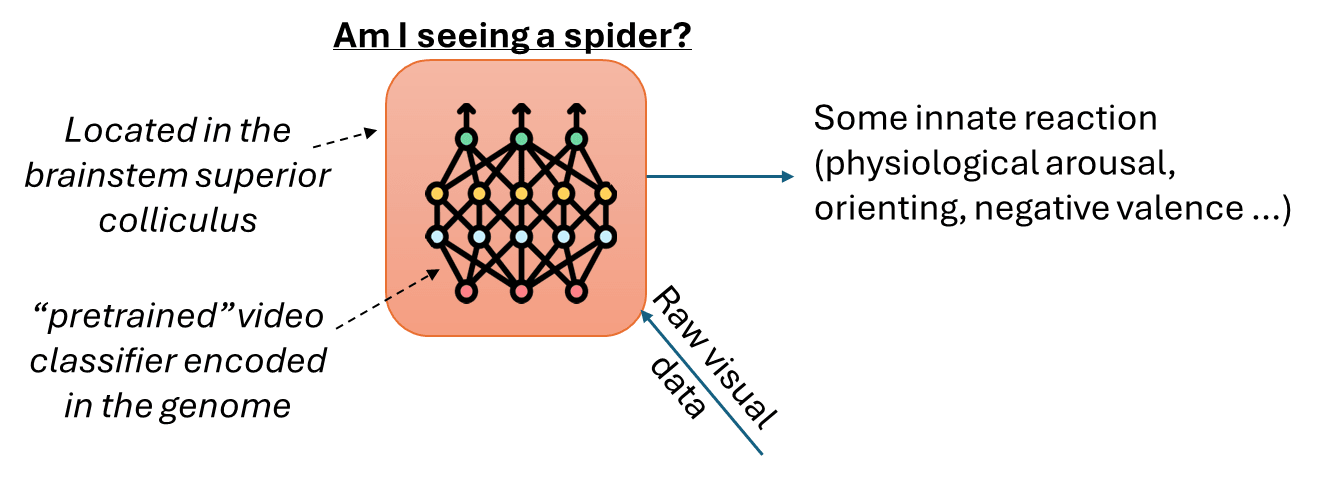 Note that these are all imperfect heuristics, anchored to innate circuitry, rather than developing along with our understanding of the world. We can call it a venomous-spider-detector circuit, for example, noting that it evolved because venomous spiders were dangerous to early humans.[4] But if we do that, then we acknowledge that it will have both false positives (e.g. centipedes, harmless spiders) and false negatives (funny-looking stationary venomous spiders), when compared to actual venomous spiders as we intelligently understand them. In vision especially, think of these heuristics as detecting relatively simple patterns of blobs and motion textures, as opposed to an “image classifier” / “video classifier” up to the standards of modern ML or human capabilities.