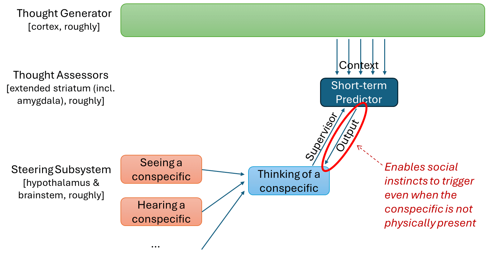 As usual, Steering Subsystem flags can serve as ground-truth supervision for short-term predictors, which supports generalization. Thanks to “defer-to-predictor mode” (see here), we wind up with Steering Subsystem social instincts activating in situations where nobody is in the room with me right now, but nevertheless I find myself intrinsically motivated by the idea of Zoe feeling good in general, and/or Zoe feeling good about me in particular.