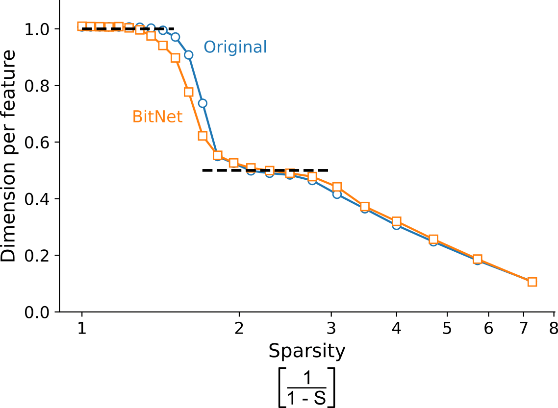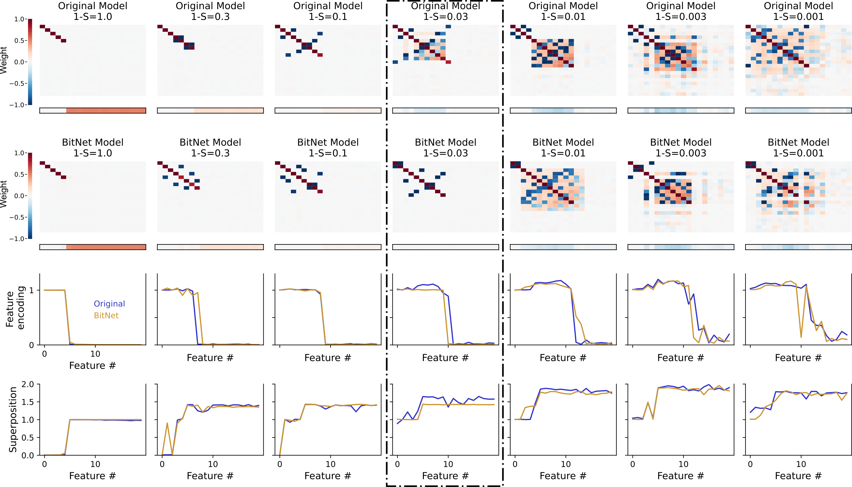 The take-home message is that BitLinear networks are similar to their dense equivalents in terms of how feature superposition emerges. Perhaps, BitNets have a slight upper hand in some sparsity regimes.