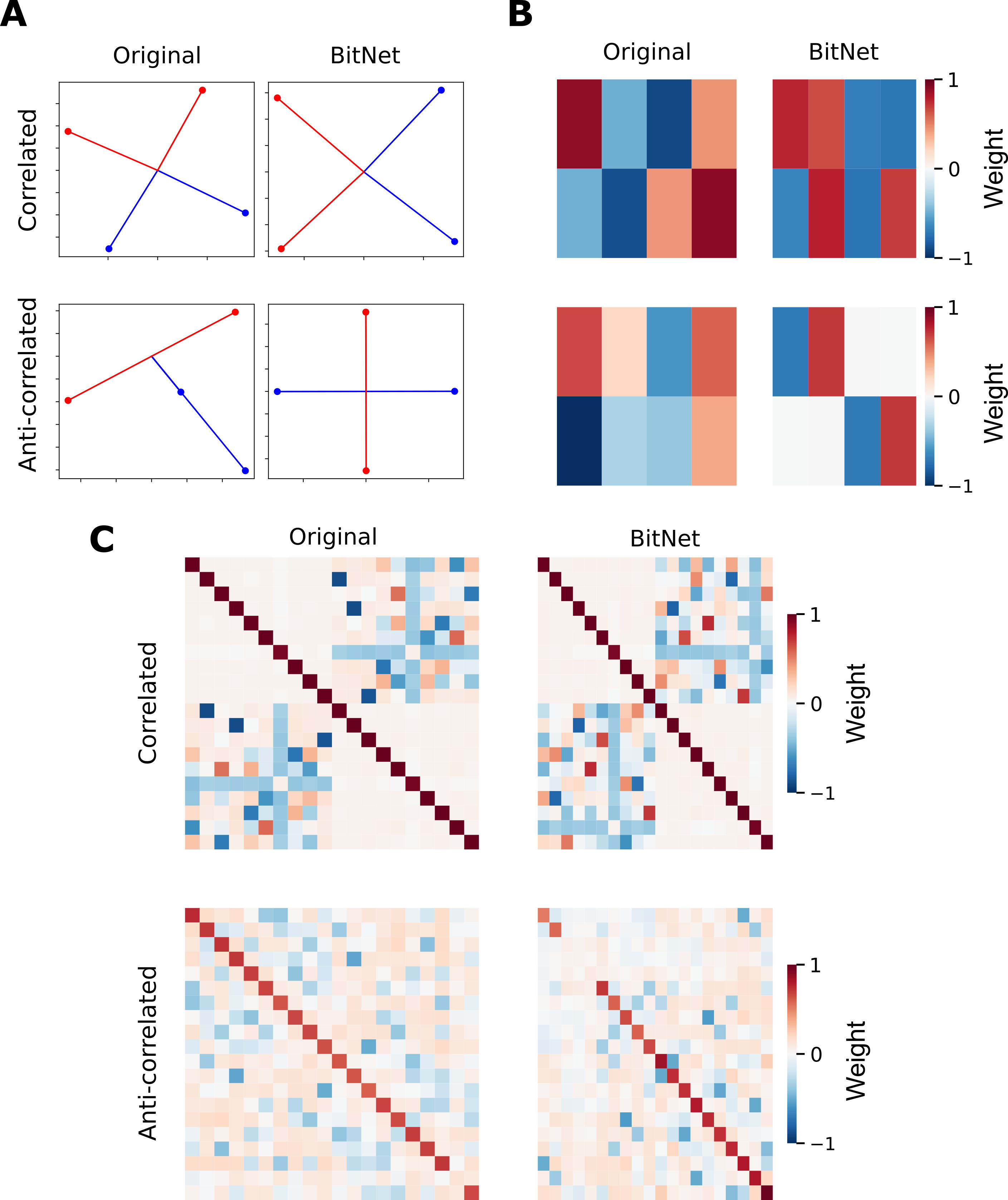 And I report that these results also hold for the case of BitNets. I think it might be noteworthy that, when inspecting the actual weight matrices (panel B), it is clearer that BitNets encode features more ortogonally than the original networks (which is in line with the previous results that I mentioned in which features are encoded more antipodally in BitNets). For completeness, I also added the case in which features are anti-correlated in two bundles (bottom row).