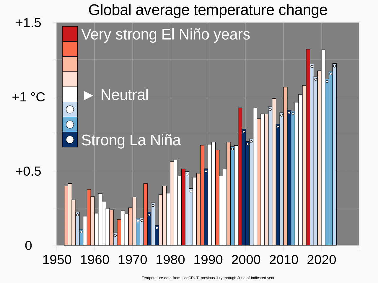 Unsurprisingly, during the El Niño period, when surface waters are warmer, more heat is released into the atmosphere, leading to warmer global surface temperatures. In general, years with El Niño are hotter and years with La Niña are cooler on average. This is a pretty reliable generalisation but is not a totally hard-and-fast rule as shown in the figure below[1].