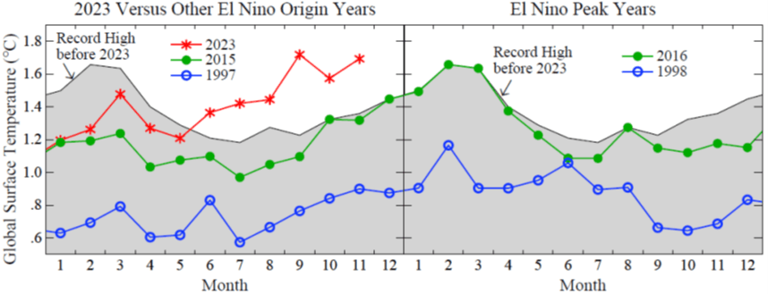 'Due to the lag between the development of El Niño and its full impact being felt on global temperatures, it is plausible that the current El Niño will have a greater impact on global temperatures in 2024 than it does in 2023.'
