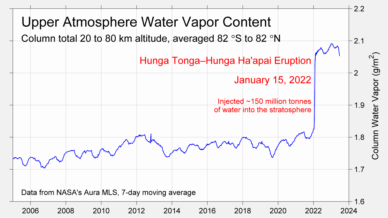 The extra atmospheric water vapour probably isn't going anywhere soon. This NPR article claims that the water will take 5-10 years to dissipate.
