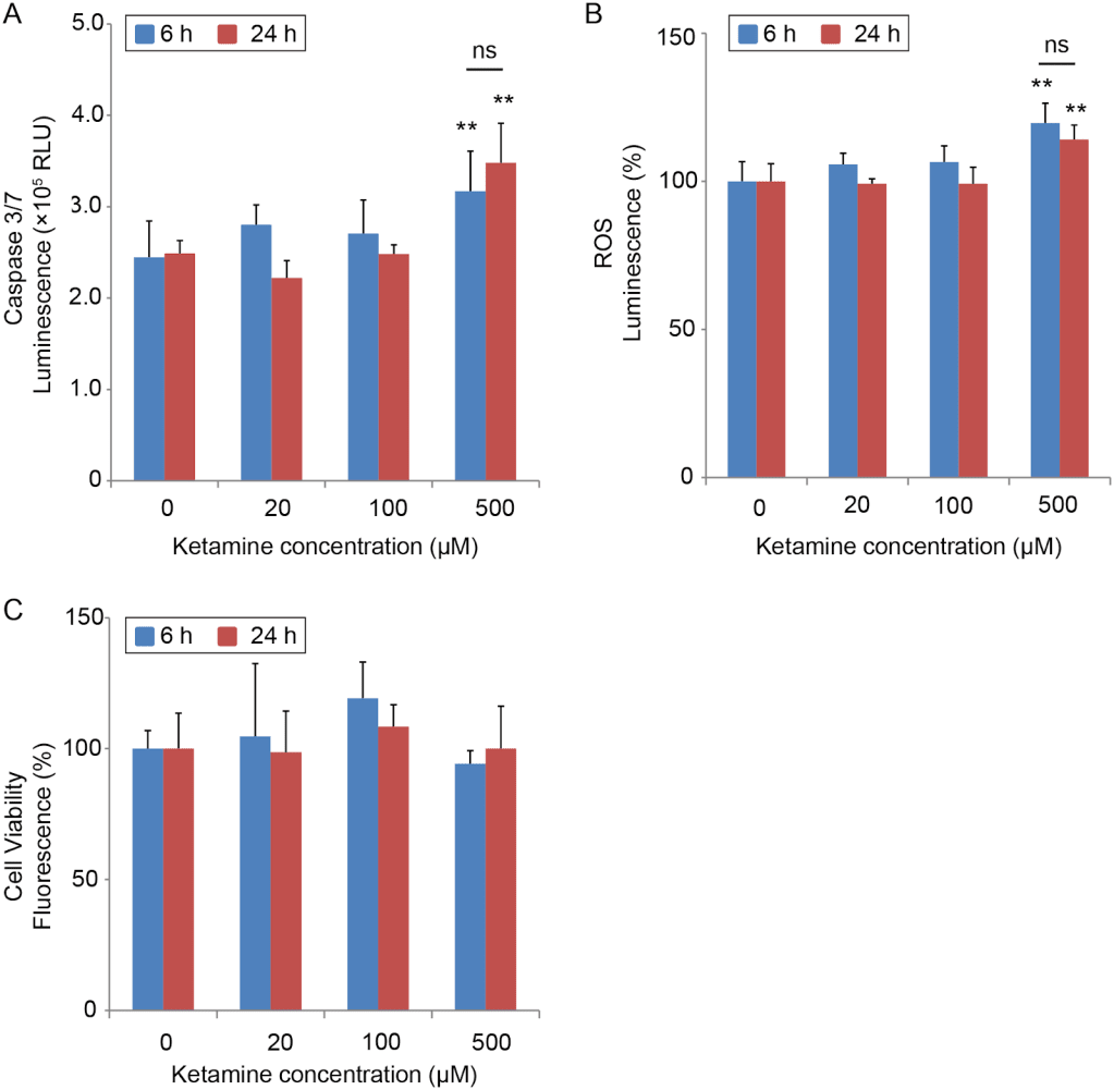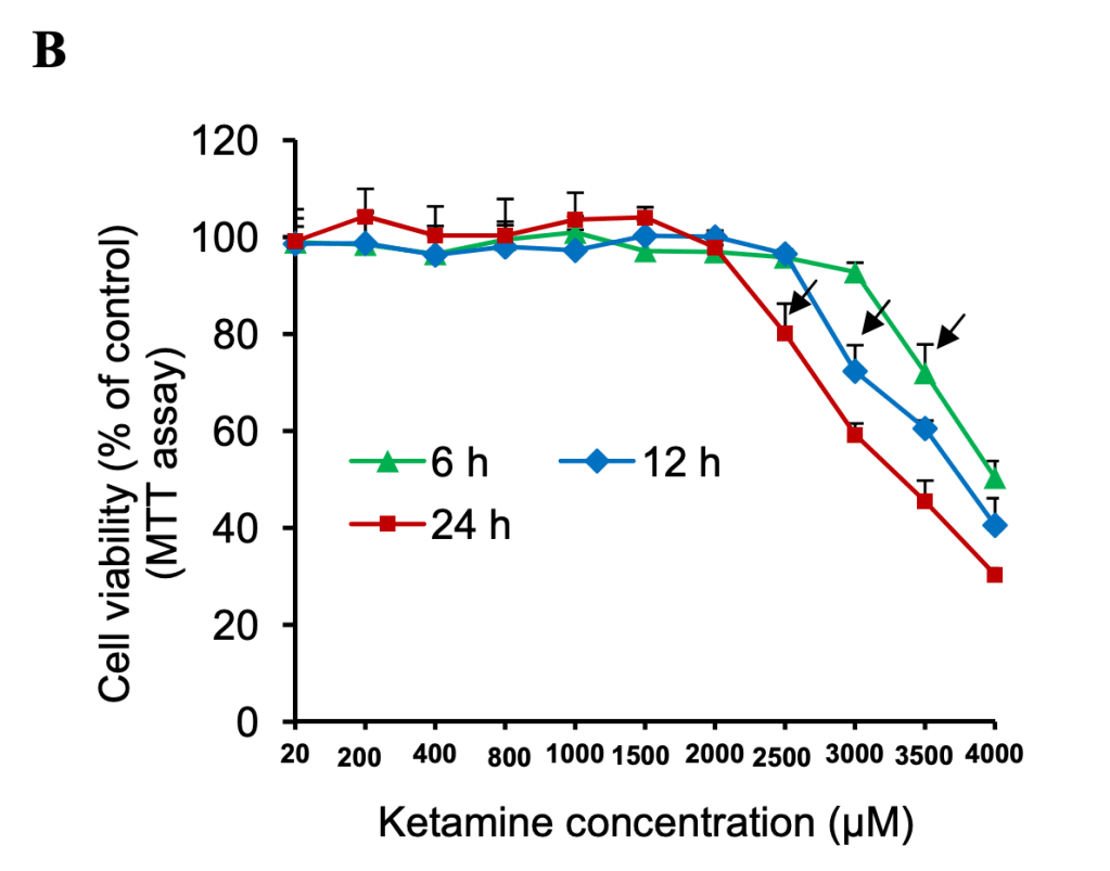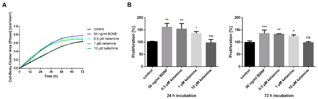 As you can see in the bar chart, ketamine was either neutral or positive. However, less ketamine was more beneficial- there was more growth at the lowest dose of ketamine than the highest (which was indistinguishable from control), and more growth after a 24 hour exposure than a 72 hour exposure.