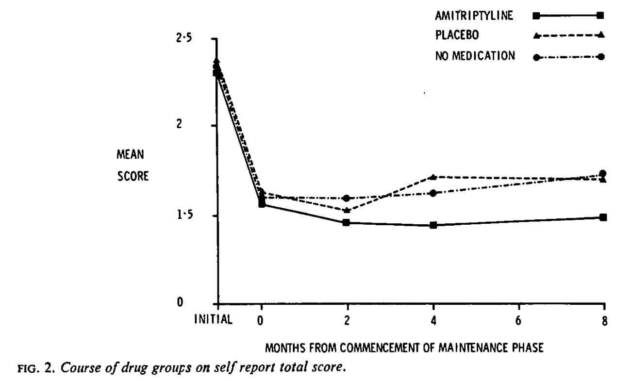 I looked through the depression studies cited in that big meta-analysis, but I didn't manage to find a graph precisely like the Prozac graph but with an additional no-pill group. Here's the closest that I found, from a paper called "Effects of maintenance amitriptyline and psychotherapy on symptoms of depression". Before I get into all the reasons why this isn't directly comparable, note that the placebo and no-pill curves look the same, both on top: