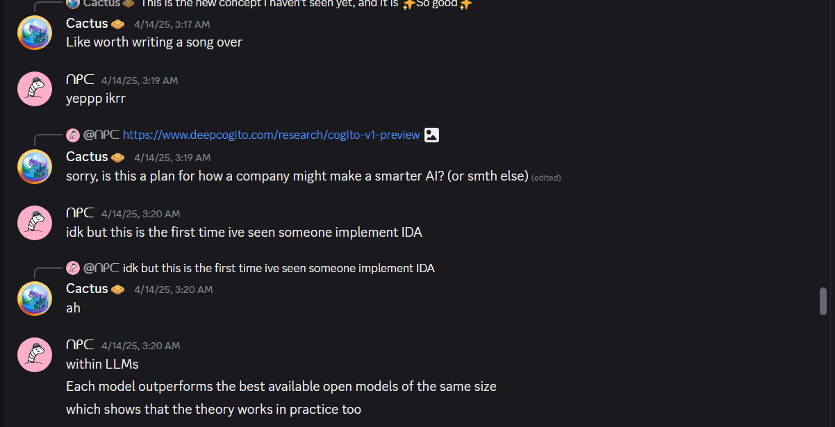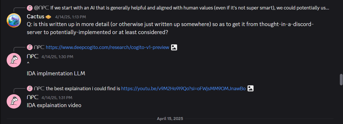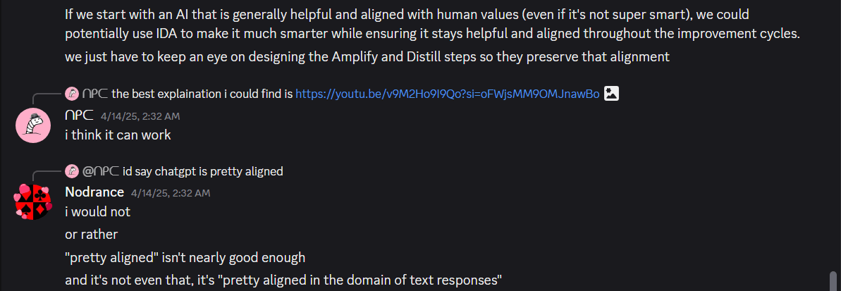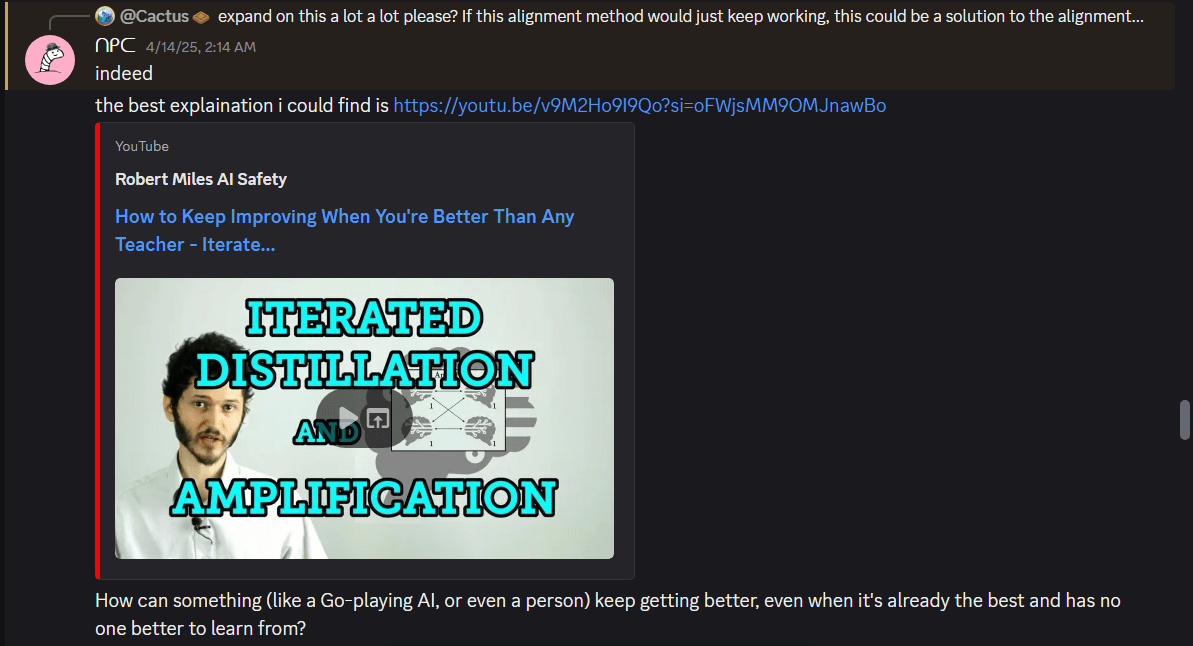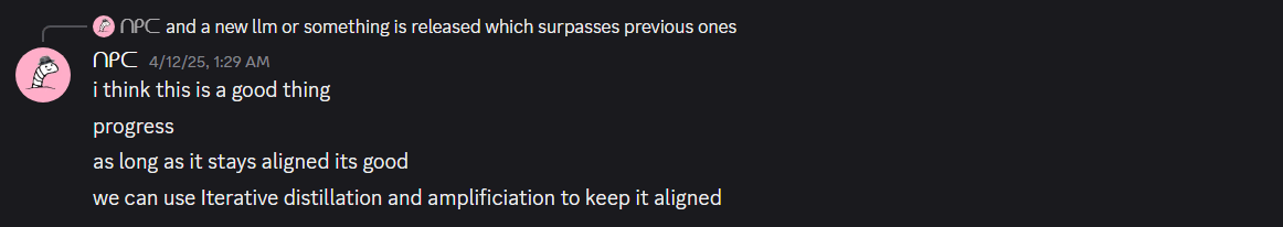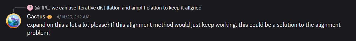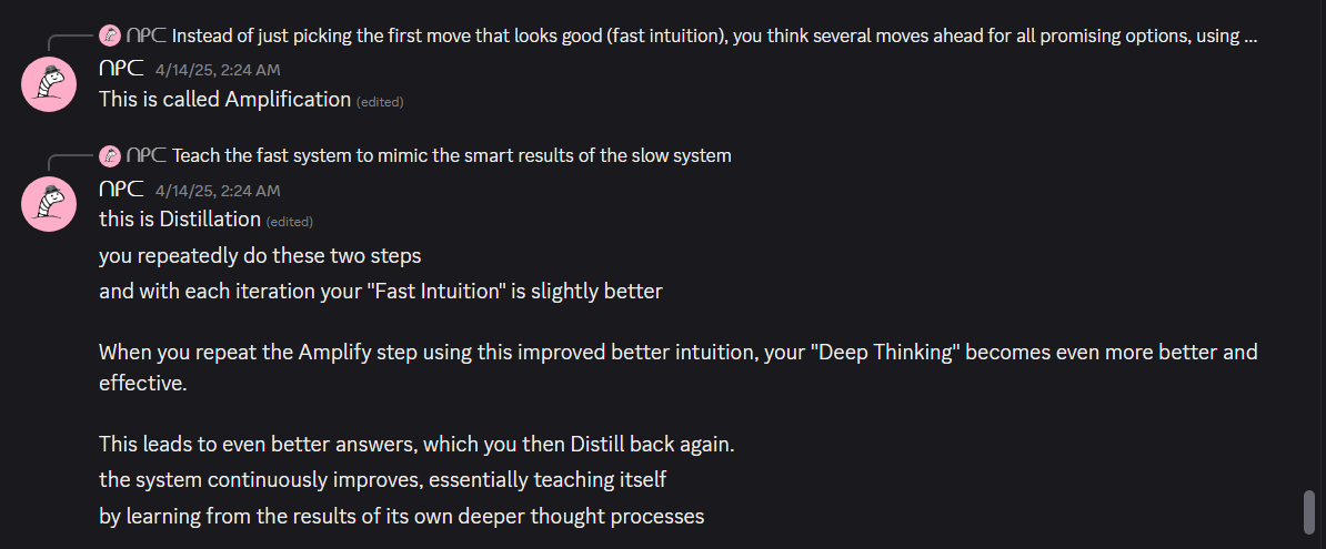 If you instead use an algorithm that works by comparing 3 or more options a bunch of times, (or I suppose if it works by still just comparing 2) you can make a “big” DecisionBot make decisions using such an algorithm, and train a “small” DecisionBot to act like this “Big” DecisionBot. Now, you can make “small-small” DecisionBot make all these smaller decisions, and train “small-small” DecisionBot to act like DecisionBot, then, assuming our sorting-thingy-algorithm makes our several types of DecisionBots act more morally, this is an example ofiterative distillation.