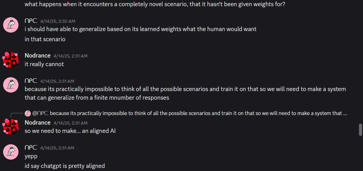 This drastically decreases the amount of preferences that need to be right, because there are just so many more options to compare that DON’T share a history similar enough and AI-involved enough for an AI to be able to make that call, than the much smaller amount that DO.