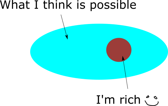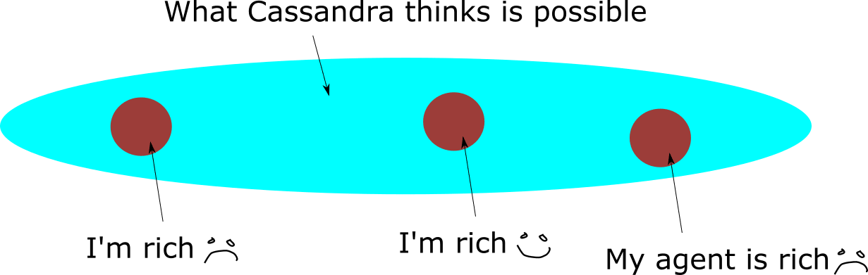 For the moment, let's assume this is a naive forecast; I'm not trying very hard to account for the fact that I'm delegating to an AI system to make me rich, I'm just imagining what it would be like to be rich in the future on base rates[1]. It looks good, and I think I can pull off the AI-make-me-rich project, so I go for it. However, Cassandra, who is much smarter and better calibrated than me, has a different view. She has taken into account the fact that I'm delegating to an AI system to do the job, and she sees a different set of possible outcomes: