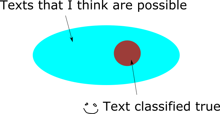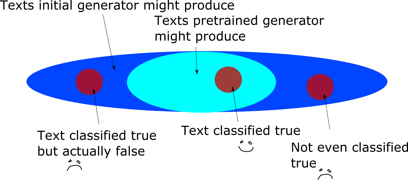 A solution to this problem that would obviously work is to make "texts I think are possible" and "texts my generator might produce" identical as probability distributions. Then, if conditioning my text distribution on "seeming true" usually produces true text, so will conditioning my generator on "seeming true". It is not, however, easy to see how to create a generative model that matches my distribution over texts. Such an endeavour would take science much more advanced than we have today. However, I may not actually need to build a generator with an identical distribution directly.
