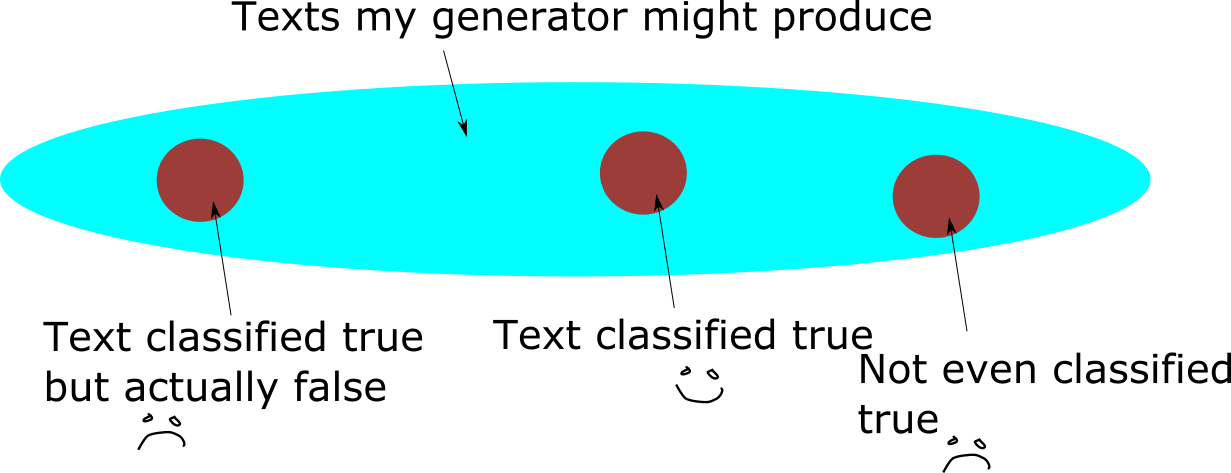 I have a text generator which is some arbitrary machine learning system (it may be something quite different to a pretrained language model). Suppose that I also have a general intuition about whether a text I'm reading is true or false. Suppose I'm really good at this when I'm reading normal text: I have a rate of 1% false positives and 1% false negatives. I want my text generator to produce text that makes true statements.