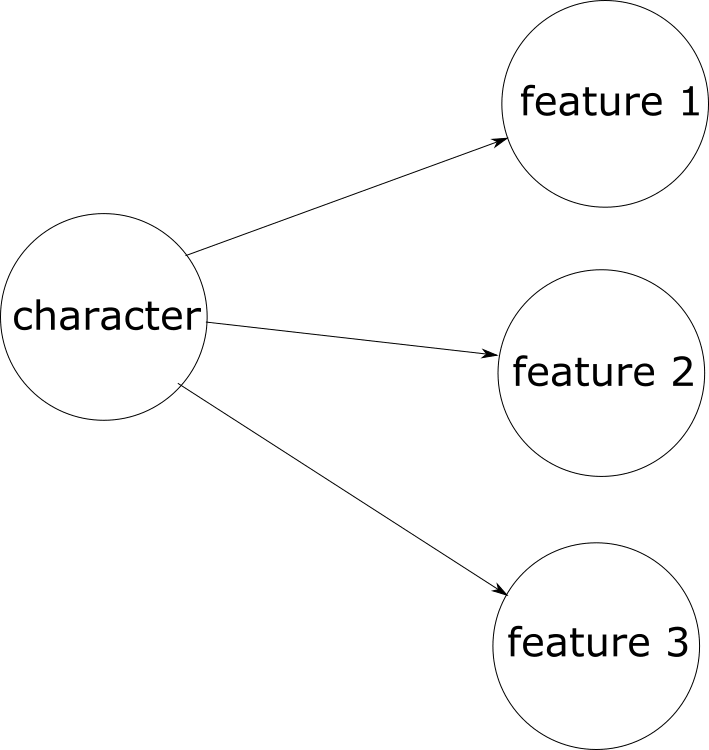 There is a connection between the idea of feature distributions and the idea that LLMs simulate different characters. Suppose that in practice, we often understand text partly by inferring things about the person who's writing it (I do this). In particular, suppose we often model various textual features as depending on the character who wrote it in a manner like this: