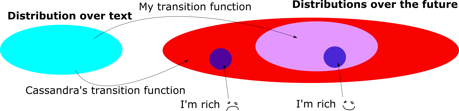 The second assumption is that the generative system creates output by sampling from its own internal probability distribution. Thus problem 1 can be reduced to the problem of analysing the AI's own internal probability distribution. For problem 2, we may still do well to consult Cassandra (an unfortunately fictional entity). However, if all we want is a piece of text with particular properties, we may set problem 2 aside. Let's do so for now.