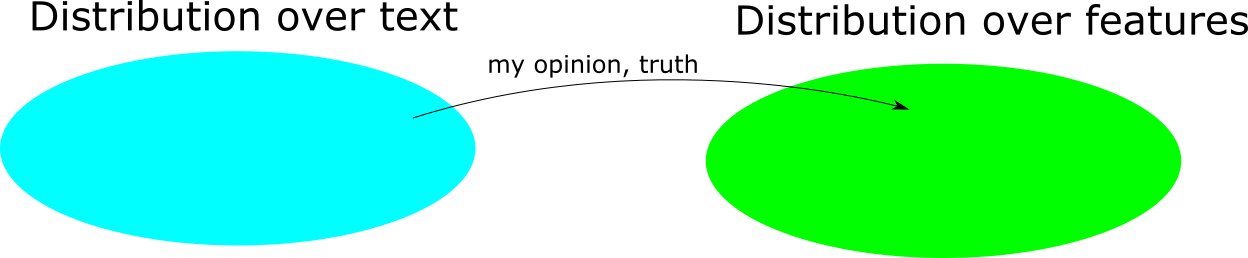 From a distribution over texts, we can compute a distribution over features. We can take a distribution over texts and pass every text through the function that sends to (my opinion(), truth()), and thereby construct a distribution over these features.